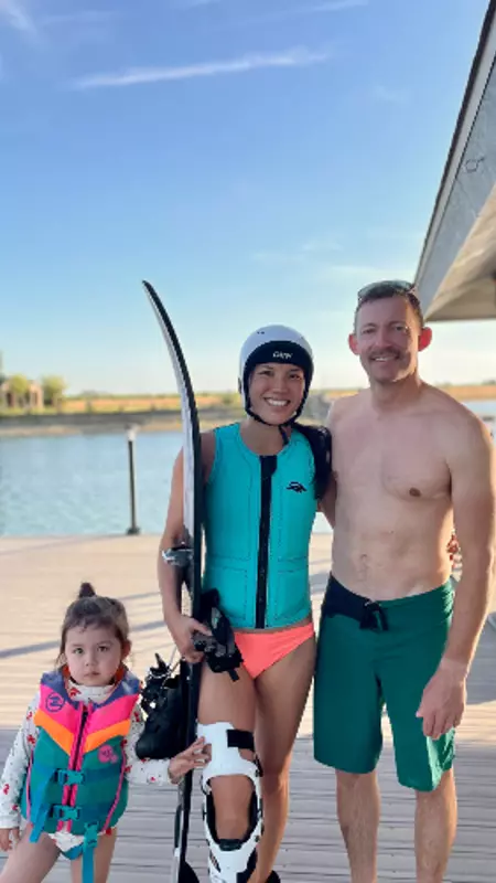 That Caty Hastings would be dumbfounded at this bionic robot woman, waterskiing cautiously down tournament ski lakes around Fresno County, California, where she now lives with her husband and 3-year-old daughter. This Caty Hastings would smile, content just to be out there, feeling at peace on the water – even in a helmet – with a lucid mind and a loving family, enjoying the sport she still so adores as part of her constant, committed work to heal her brain and reclaim herself, living her life while improving her everyday functioning.